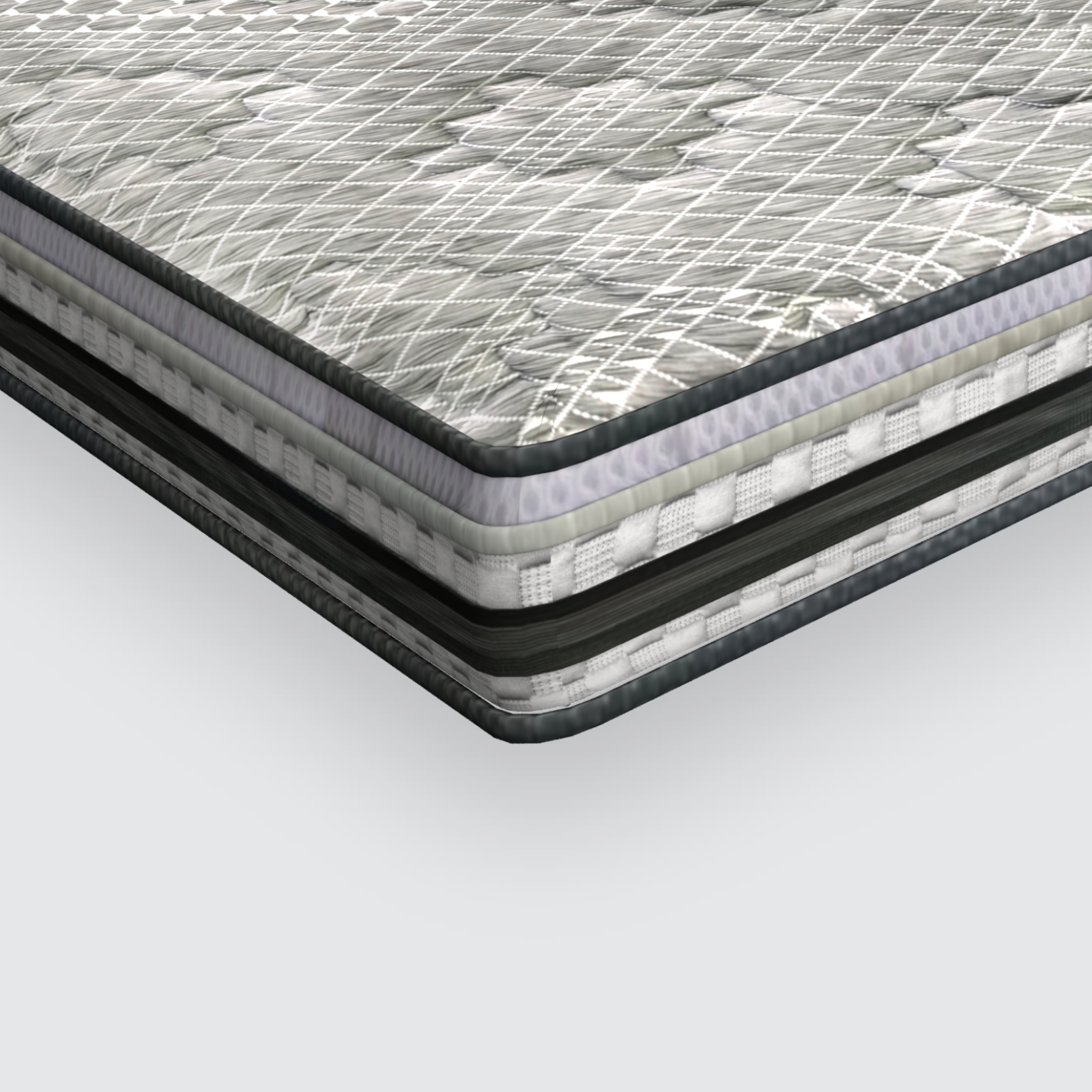 Premium Melange Knitted Fabric + Cool Gel Memory Foam + 3 Zone Pneumatic HR Foam + Backcare Rebounded Foam + Egyptian Felt + PU Foam Quilt + 3D Knitted Side Fabric + Non Skid Base Fabric