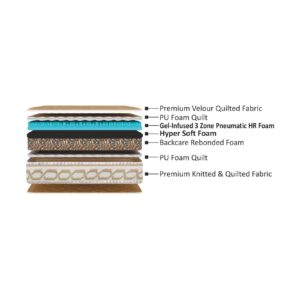 Premium Velour Quilted Fabric + PU Foam Quilt + 3 Zone Pnuematic HR Foam + Backcare Rebonded Foam + PU Foam Quilt+ Premium Knitted & Quilted Fabric