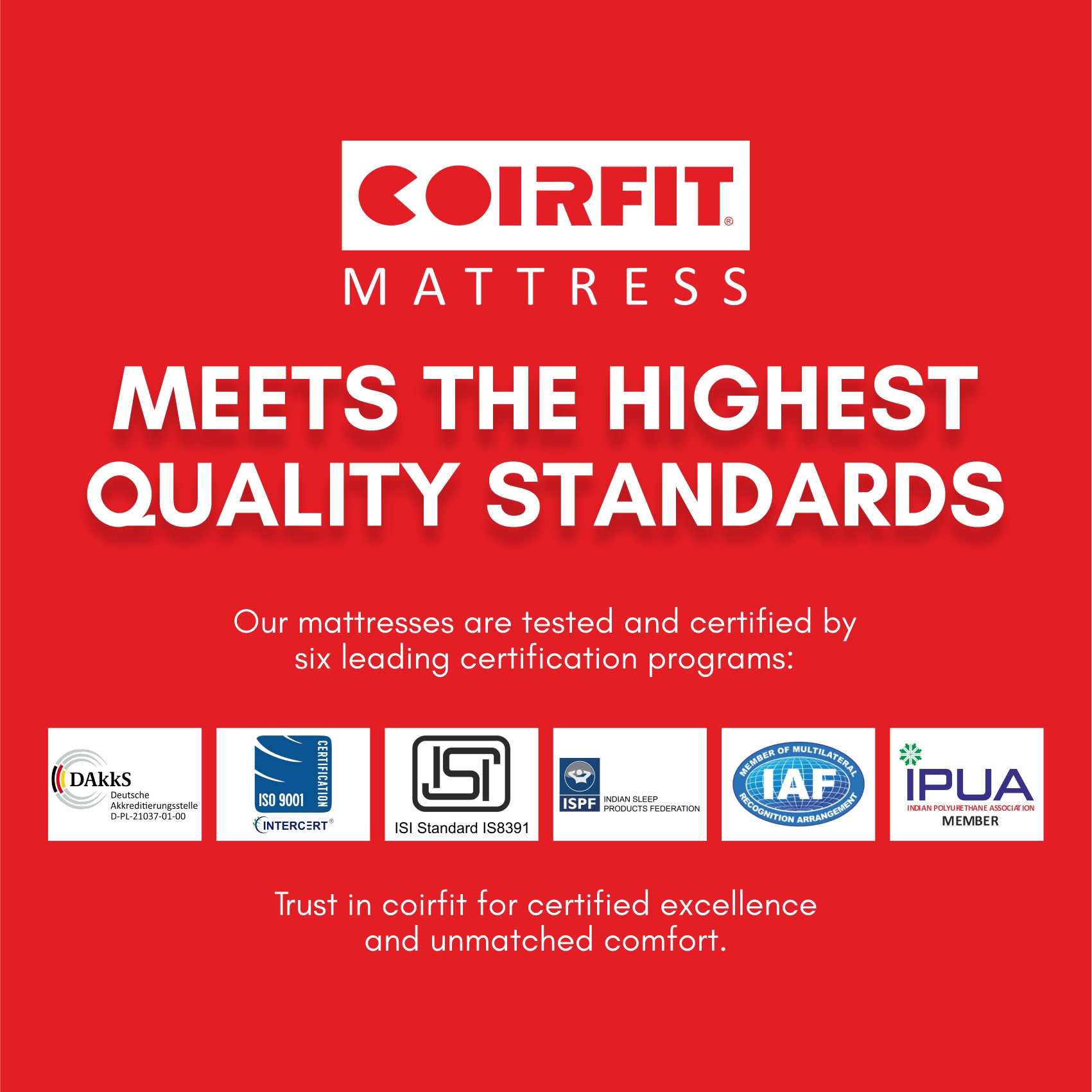 Coirfit products have been tested and certified complaint with the demanding standards of five leading certification programs-Dakks, ISI, ISO, ISPF and IAF. The highest standard possible, guaranteeing that the foam is safe for babies and children.