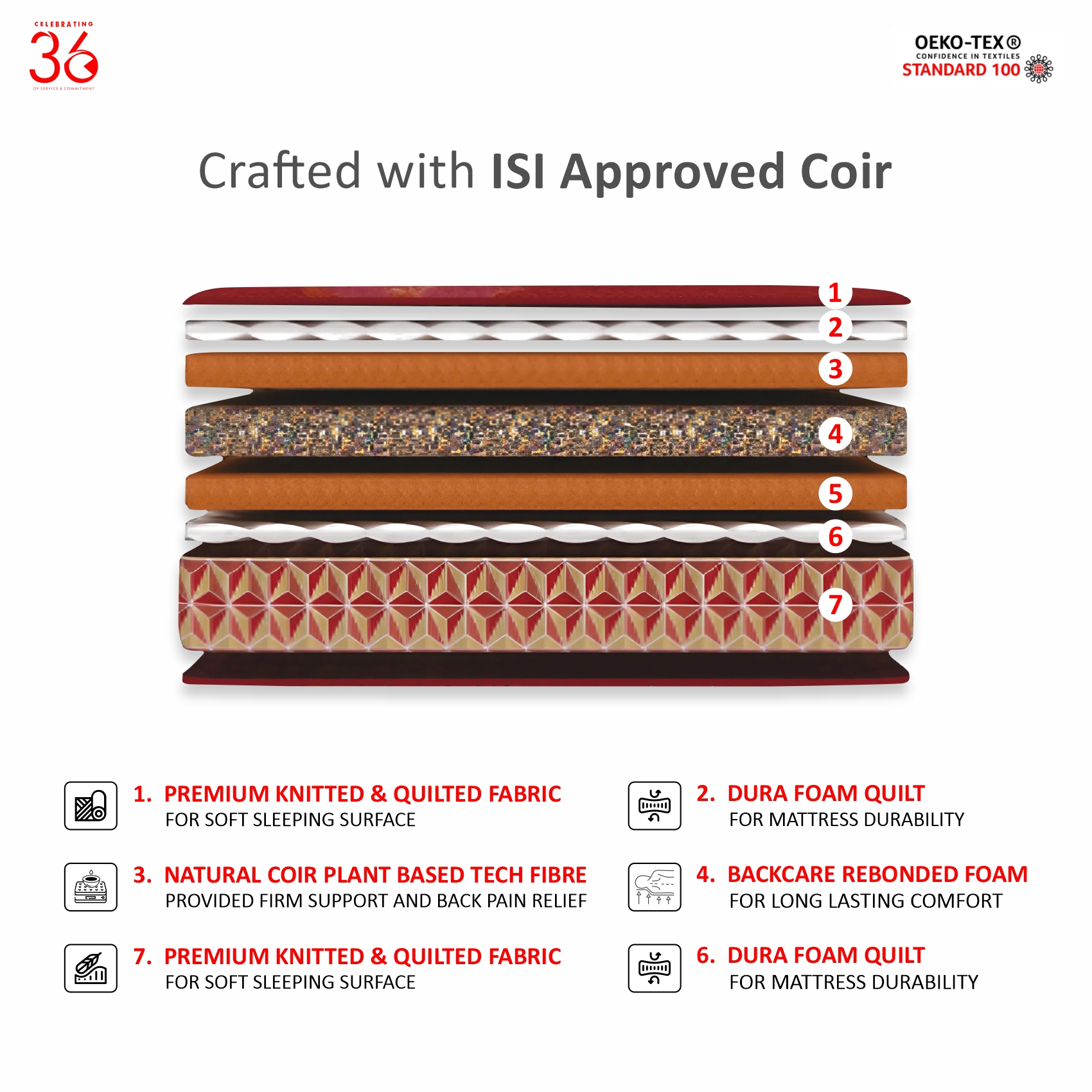 Premium Knitted & Quilted Fabric +PU Foam Quilt +Rubberised Coir+ Backcare Rebonded Foam+ Rubberised Coir+ PU Foam Quilt + Premium Knitted & Quilted Fabric